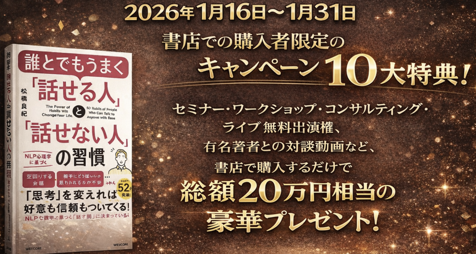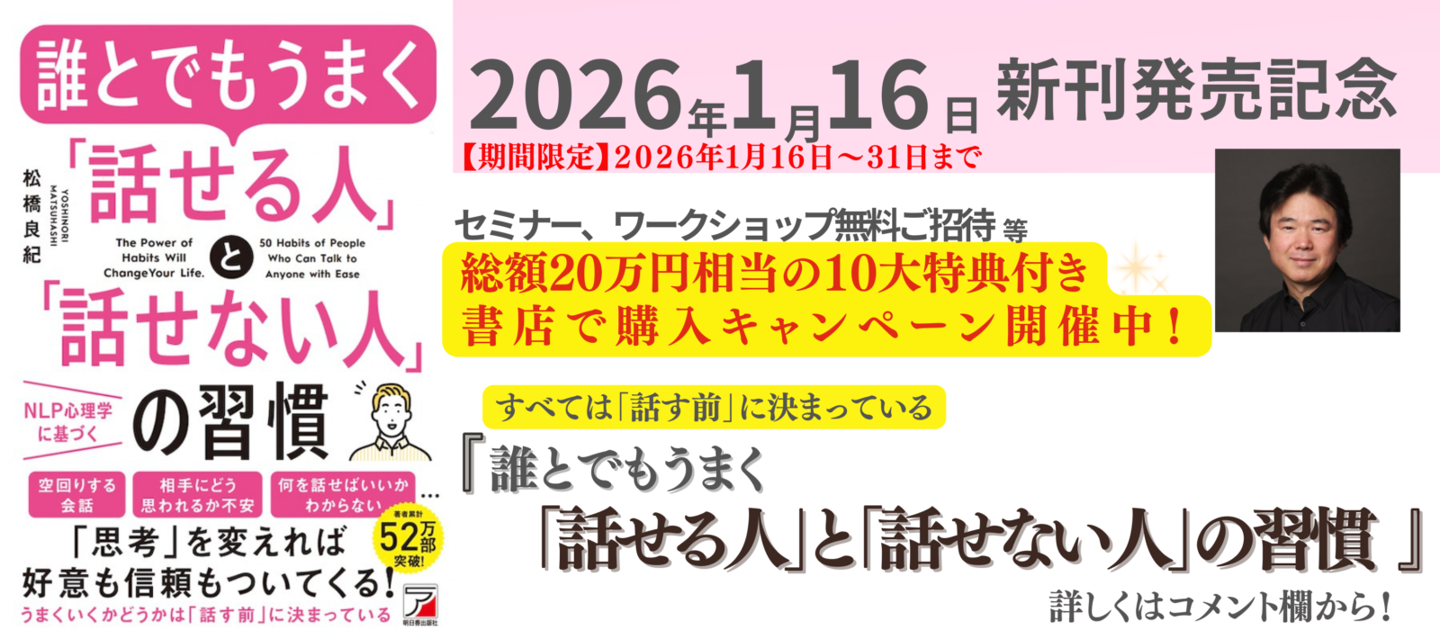 いつもご覧いただきありがとうございます 本日、私の新刊が発売になりました! そして期間限定キャンペーンが正式にスタートしました✨ 松橋良紀 新刊 『誰とでも話せる人と話せない人の習慣』 そして同時に、 書店購入者限定・総額20万円相当の特典がつく... -
